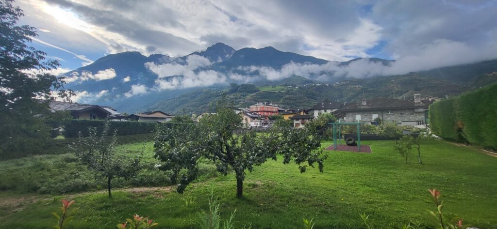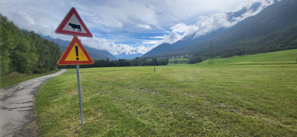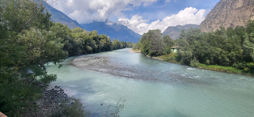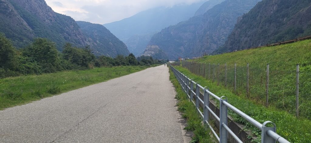 Cycling east from Aosta to St Vincent on the Dora Baltea River cycle route, except where I missed the signs or the signs disappeared – nice easy cycling, apart from one wee gravelly uphill. Where I missed my turn I could have gone back a short way and then continued on the correct route; gone through a busy tunnel that I didn’t fancy or go on the old road that skirted right of the tunnel and this seemed to best alternative except that it was closed for maintenance – closed but the metal barrier was open so I decided to take my chances – the road was a bit pot holed but in terms of work going on when I went past there wasn’t too much going on and no heavy machinary and by pure chance when I got to the other end of the works a workman was opening the barrier so that he could drive in and I just cycled past – if anyone was bothered by me cycling through they never said.
