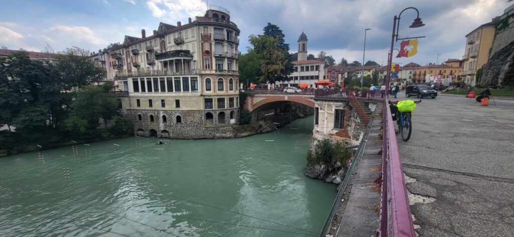 Good first 22 miles or so – rain had come on but still pleasant for cycling in. Quiet roads initially and busier towns but there were cycle paths – nothing like the infrastructure in France and Belgium though. In the town of Vercelli on a shared pavement was where I got my first puncture – hopefully last but don’t want to tempt fate – it was starting to get busy with pedestrians and having a shared pavement wasn’t ideal for either cyclists or pedestrians and I was about to use the road when my rear end (of the bike) went all sluggish – puncture – and this coincided with the rain getting much heavier. I pushed Phil to the end of the road where there was kind of a square, took everything off the bike; up ended Phil; rear wheel came off relatively easily – I hate taking the rear wheel on and off; tyre off and found the cause of the puncture pretty quickly; pressed the inside of the tyre against the metal electrical box that I was next to so that I could push the sharp object back to the outside of the tyre and remove it – again surprised at how easy I got it out and it turned out to be a bit of glass; inflated the inner tube to patch the hole but it was deflating so quickly I couldn’t locate the hole and it was now pouring with rain so went for the easier option of using a new inner tube; at some point during this realised that I’d cut my thumb on the glass and there was blood on me, the inner tube, pavement, etc and I’m now trying to put everything back together with my thumb wrapped in a sweaty-snotty-when did I last wash it hanky – this combined with rain water and a manky tyre all probably a good case for an infection but writing this a good few days later all seems good except for a sizable scar on my thumb – yes I should have used tweezers to remove the glass from the tyre but went for the quicker option. Inner tube and tyre back on but then I have a fight getting the wheel back into place – I’ve done this a number of times over the years and been shown what to do countless times and I still struggle with it – occasionally I get it to slot in nice and easy but this time make a complete pigs breakfast of it and somehow I’ve managed to jam the wheel half in half out and I can’t budge it! Transpires that there is a bike shop only a couple of minutes away but seems like ages away when I firstly carry my panniers and tent and leave them at the shop and then go back for an abandoned upside down Phil. Carrying the bike isn’t easy but a nice fellow stops to help, thinking it’s just the chain that’s slipped – his hands are now covered in my bike oil but luckily doesn’t seem to have got any on his nice white sweat shirt – he translates to the bike shop what the problem is, makes use of the shop’s sink to wash his hands and goes on his way. It doesn’t take long to get bike fixed but I really must get better at doing this myself as there is not always going to be someone nearby to help me – need to get booked onto a bike maintenance course when I get home!