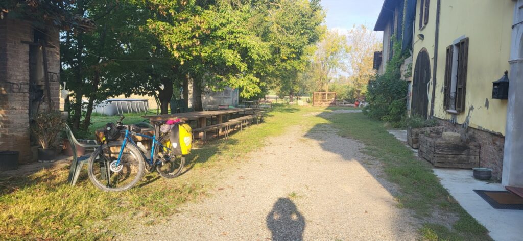 It was a beautiful afternoon and evening and the terrain was easy going so pushed on still trying to cover as much ground as possible. Later on though I was cycling towards ominously threatening clouds – this combined with the next campsite being quite a distance away I booked myself into a wee hotel – I feel as if turned into a lightweight but it was a definitely a good move – it was at the end of the road, just outside the town of Calendasco, on the Po river. After not getting much sleep in the tent with the thunder and lightening and the noisy hotel the night before that this hotel was perfect – no noise at all and I got a much need good night’s sleep – I also missed the rain – judging by the water on the road it had been heavy in places but I missed it all.