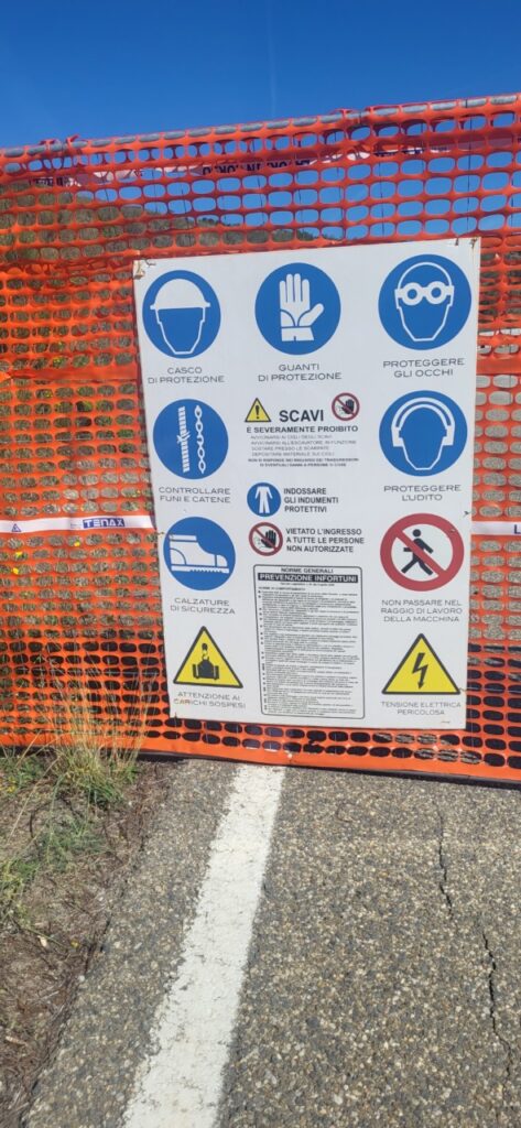 There was still no evidence of roadworks or any noise. I googled “do roadworks take place on a Sunday?? in Italy ” Only in an emergency” according to google – that didn’t help. I’m never keen to go backwards and it was getting hot and I really didn’t want to do any more hills. I broke all construction site health and safety rules (Dad you’d had better stop reading) and snuck through a wee gap just big enough for the bike (once I’d moved a fallen post). I kept going, enjoying the scenery and having the road completely to myself but a bit apprehensive that at any moment I’m going to get a telling off and made to turn round. A good few kilometres on there were signs of works vehicles but still no construction noise and no signs of workmen and then just round the corner I came to the tunnel where the work was taking place BUT not on a Sunday thank goodness. The tunnel was well lit and looked as if it was going to be re-tarmacked but the surface was still good. A bit further on, it looked as if the tunnel was completely fenced off and my way was going to be barred – was this the point where I was going to have to admit defeat and turn round? Luckily not – there was a slightly raised walkway just wide enough for me to cycle on without having to take the panniers off, and I got a good view of the rather large hole that was being fixed.