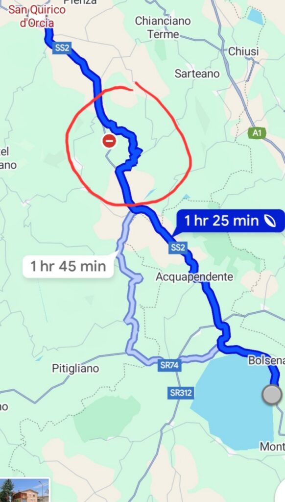 On Sunday I was cycling from just north of a wee town called San Quirco d’Orcia to Laga di Bolsena. The Komoot route took me on route number 2 and a number of wee side roads – it was going to be another hot day – because of this I left early and as the roads had been quiet the last couple of days I decided to stick just to route 2 which would make it shorter and more importantly much less hilly – worse case scenario if the road was too busy and unpleasant I could pick up the side roads.