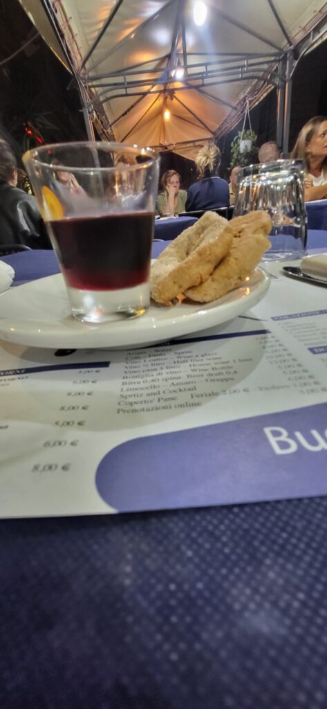And then I had pudding – kind of the equivalent of my Mum dunking gingernut biscuits in her tea but Italian style – Ciambelline al Vino – biscuits that you dunk in wine and they were good and I had plans to come back for a 3rd night but…..