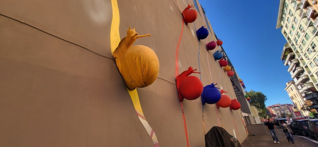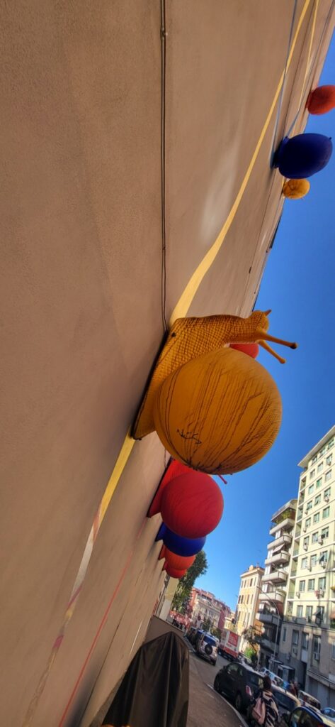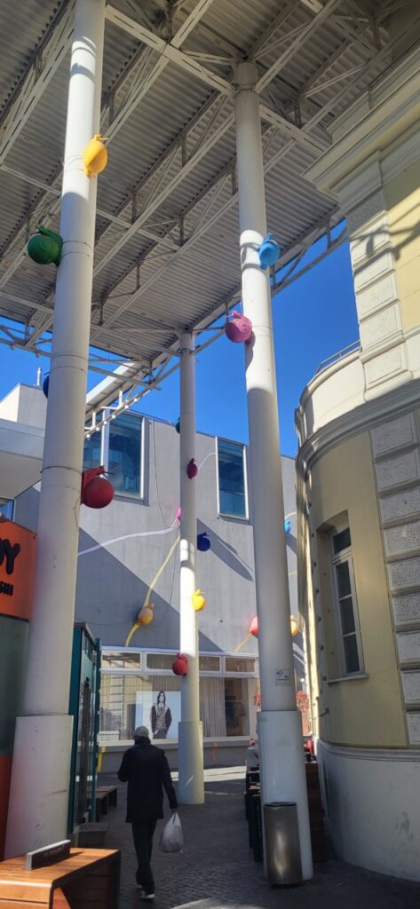 I walked back to the city centre via Decathlon to buy a bicycle bag – failed on this and bought a waterproof bicycle cover instead and accidentally bought me a new jacket – well I needed something warm for coming back to Scotland – and then found a DIY shop to buy a roll of bubble wrap and a roll of gaffa tape – yip this is kind of typical cycle touring shopping if you are coming back by plane. I saw art of completely different nature on the shopping centre where Decathlon was – never figured out why snails was the theme but I loved it.